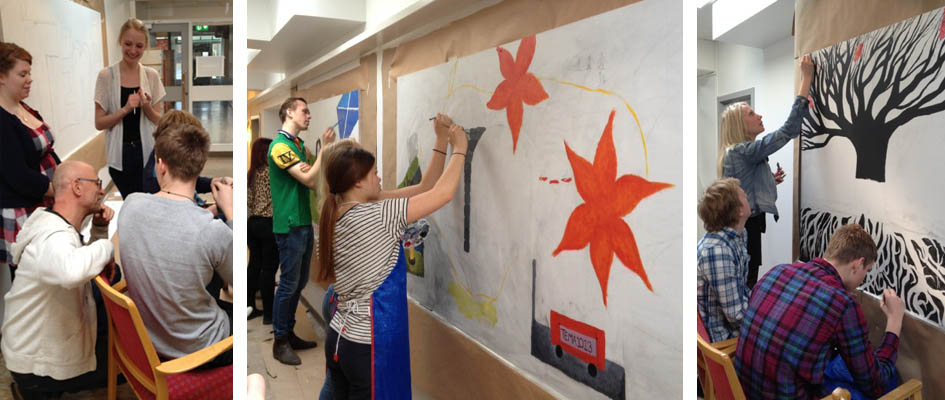 Workshop med 28 elever indelade i åtta arbetsgrupper. Syftet var att eleverna skulle bearbeta, formulera och synliggöra sina gemensamma erfarenheter i bild och text på stora väggmålningar.