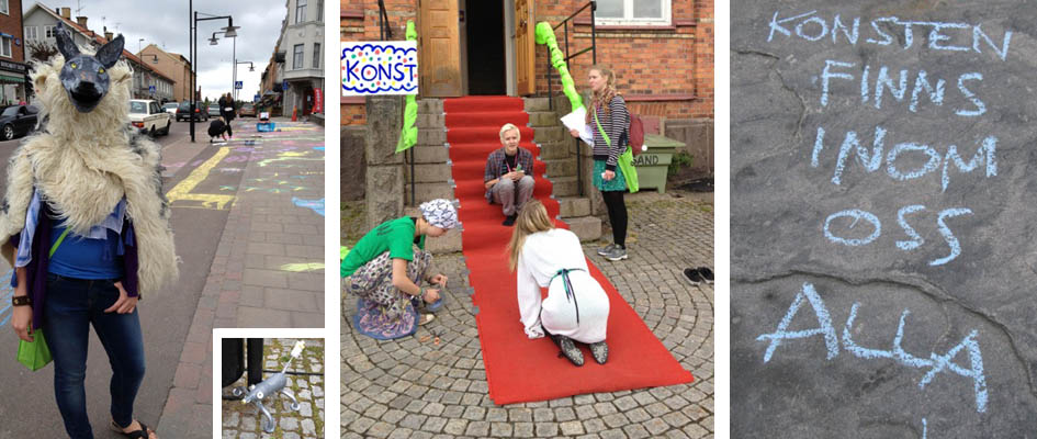 Workshop med ungdomar från hela Sverige. Syftet var att skapa en konsthändelse i Årjängs centrum. Vi skapade fantasidjur av återvinningsmaterial i vår verkstad. Diskuterade hur djuren skulle placeras på olika ställen i stadens centrum och hur mötet med Årjängsborna skulle kunna bli. Som avslutning på en gågata skapades fler djur med kritor, som en slags serieteckning. Genomfört i samarbete med performancekonstnären Ingrid Alsbjer.
